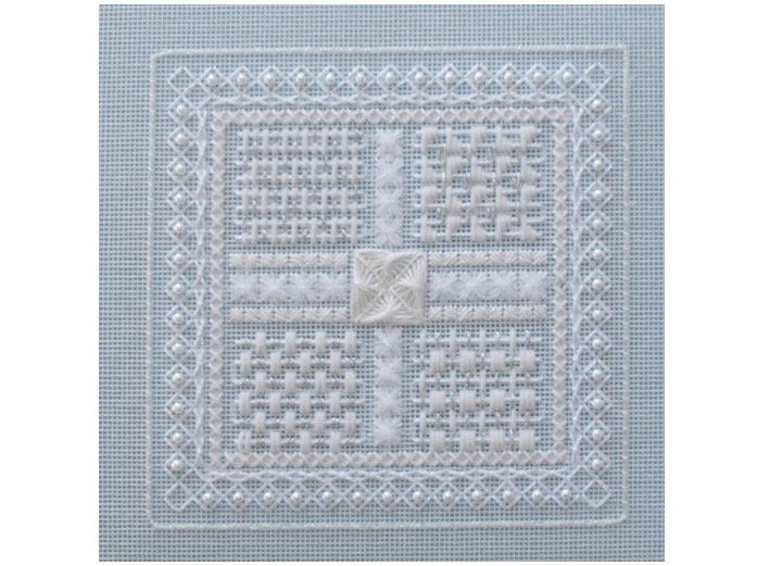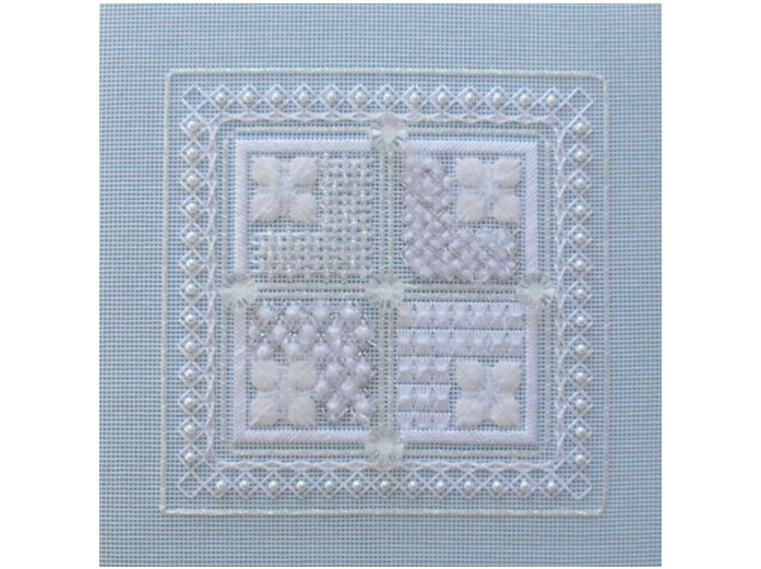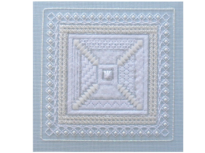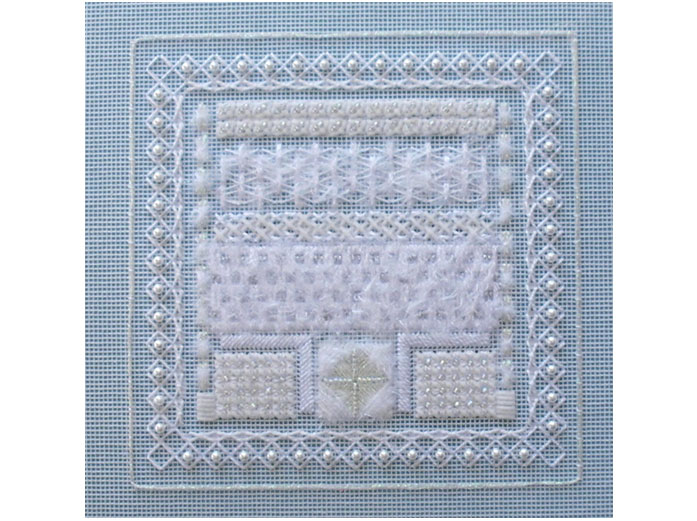 A selection of about nine threads is worked into this design, pearls and beads make this design ‘sparkle’.
